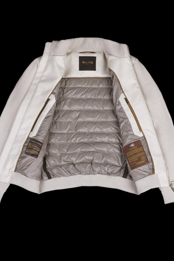Bomber jacket made from the finest yangir cashmere flannel with knit sleeves made from the same yarn.
