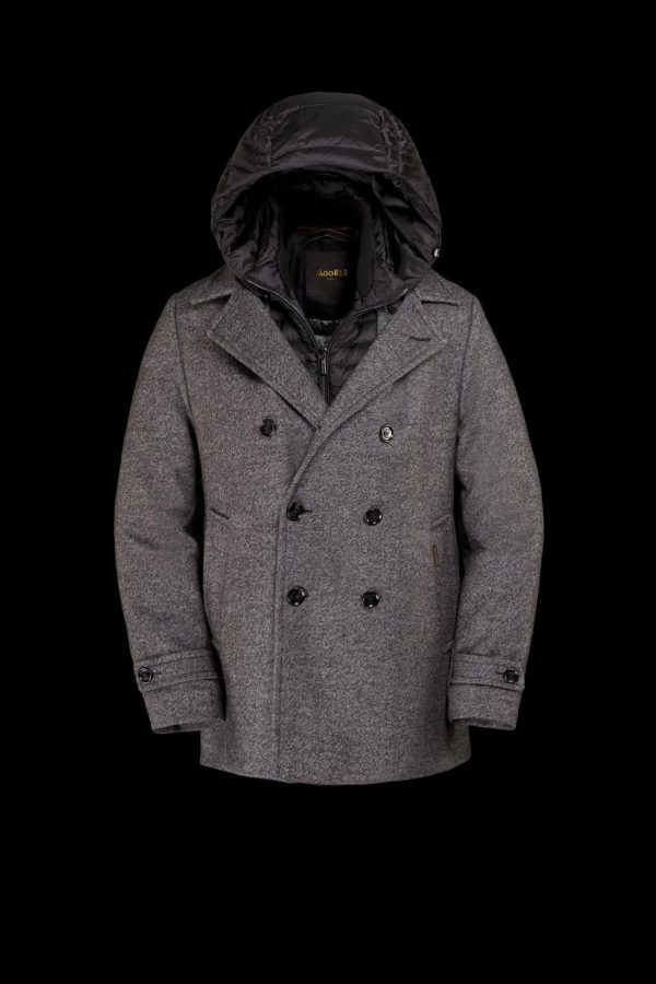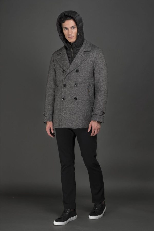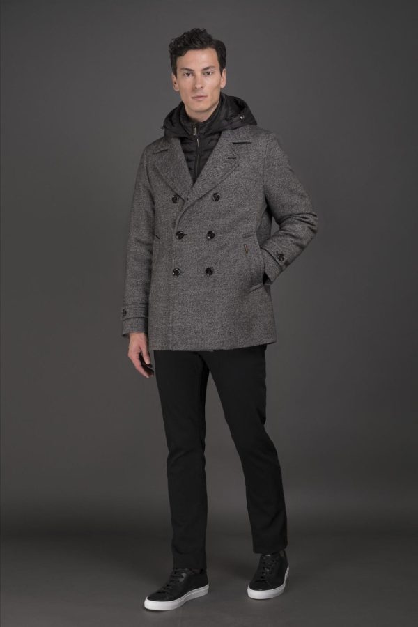 Double-breasted coat with a tailored look. Internally padded with goose down and made of pure virgin wool fabric with mouliné thread, featuring a visible diagonal on the fabric, with a soft and warm hand feel.