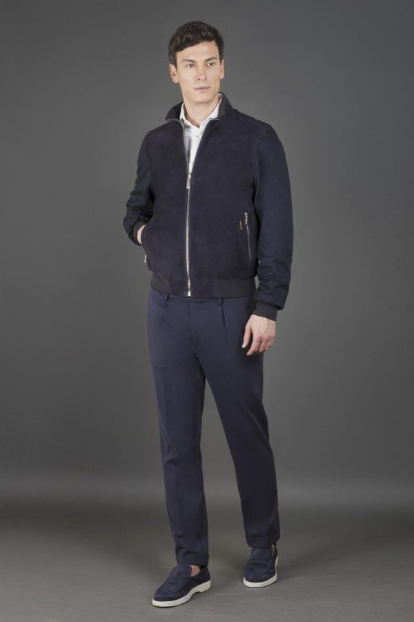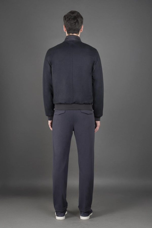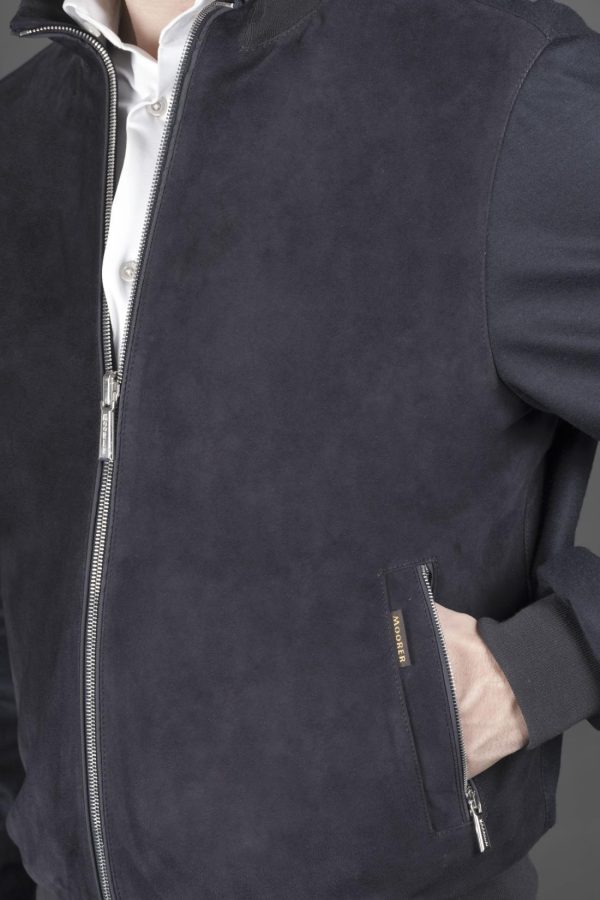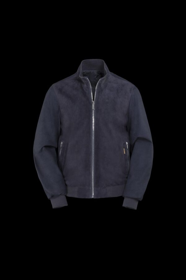 Reversible bomber, crafted with one side in ribbed virgin wool blended with cashmere, and the other in suede leather.