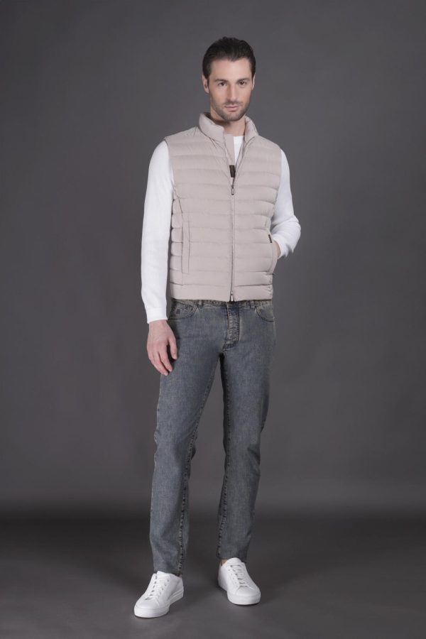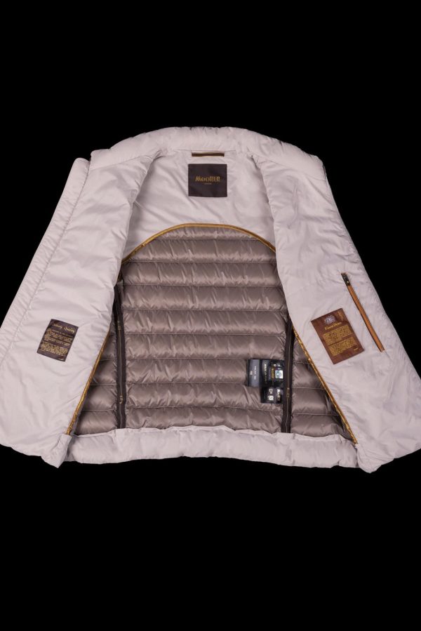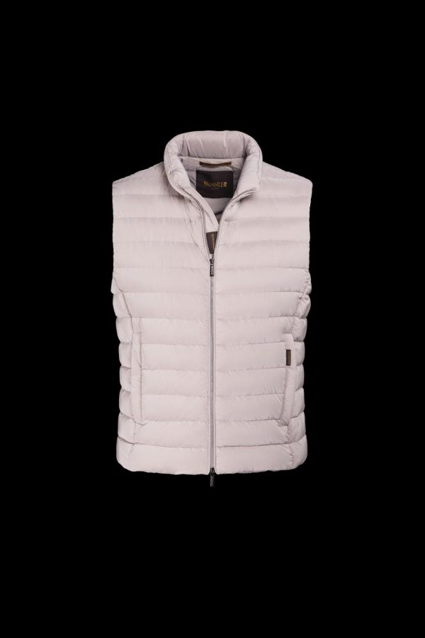 Boudin-quilted vest padded with goose down. Made of iridescent microfiber with a silky appearance and peach-skin feel.