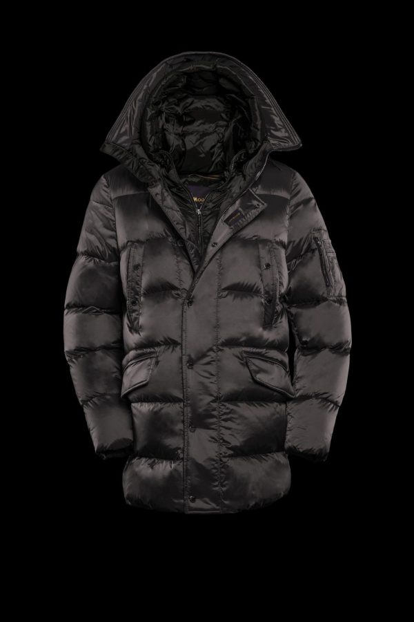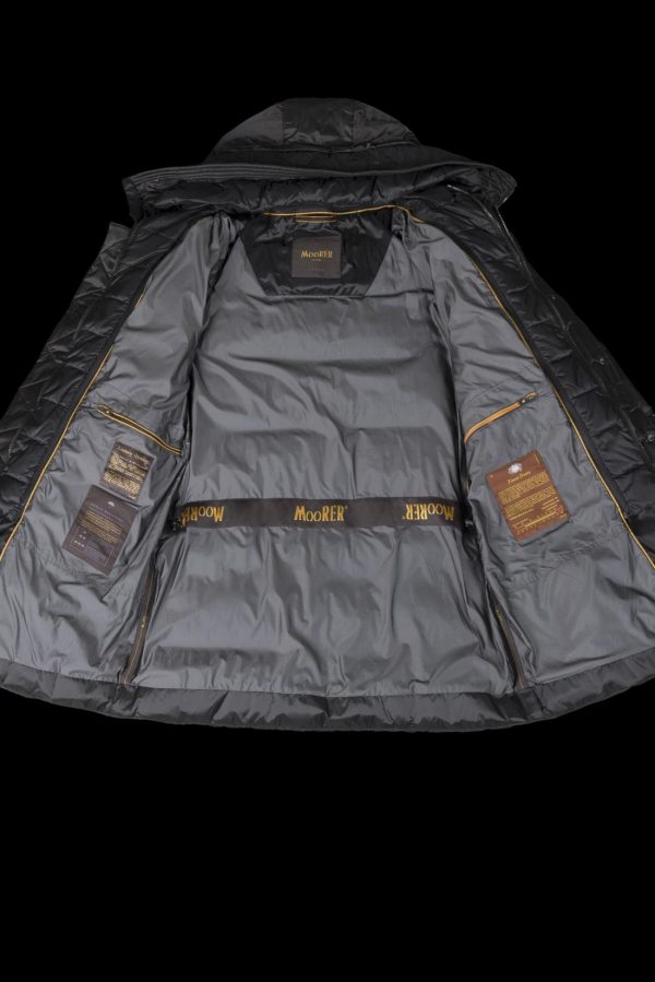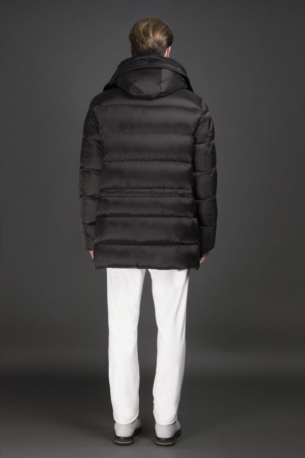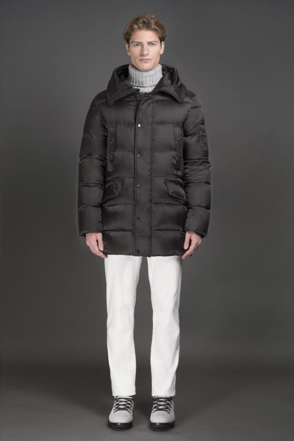 Parka with a high level of thermal insulation, belonging to the Acqua line (1 umbrella). Made of technical fabric with water-repellent coating, padded with goose down and quilted in wide boudin.