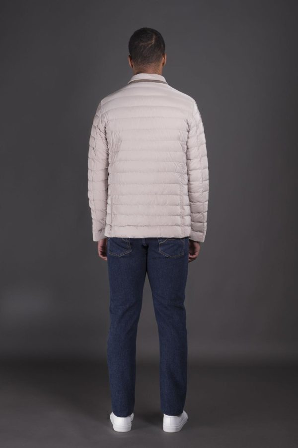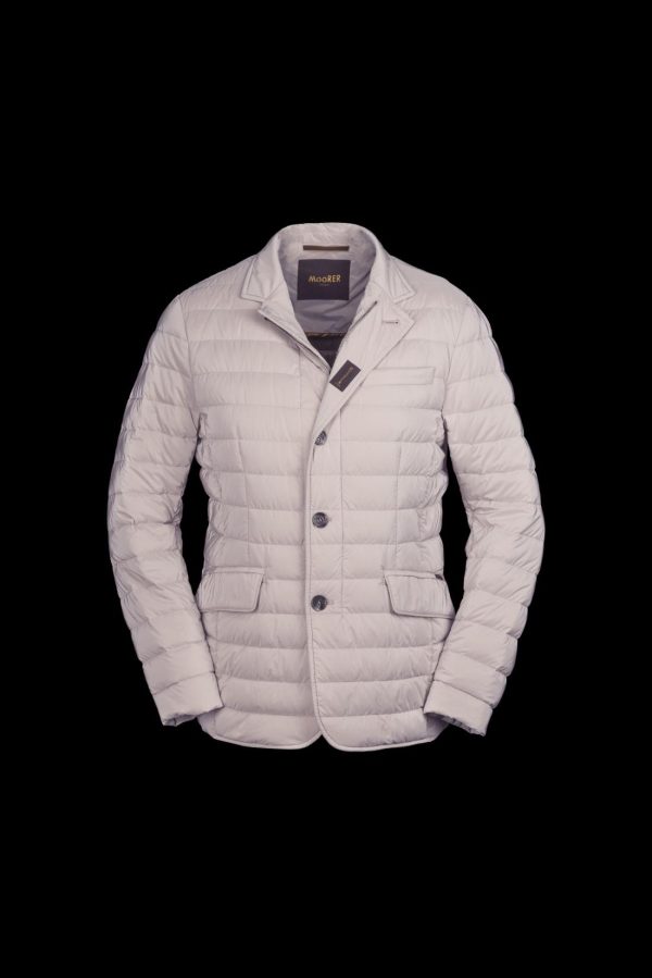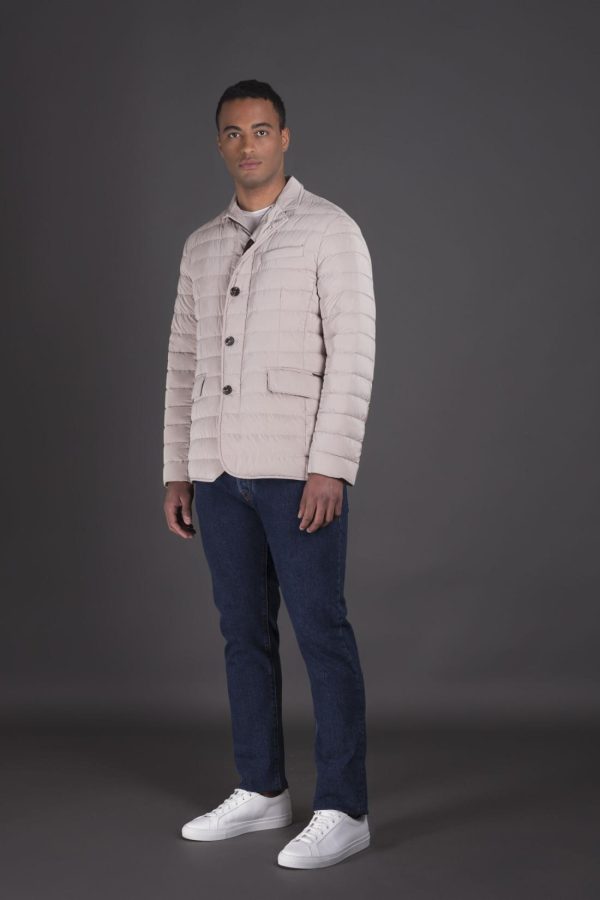Three-button jacket with a classic cut made of extremely lightweight down-proof microfiber with a matte appearance. Padded with direct injection goose down and quilted in boudin style.