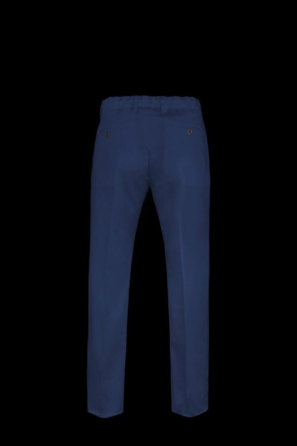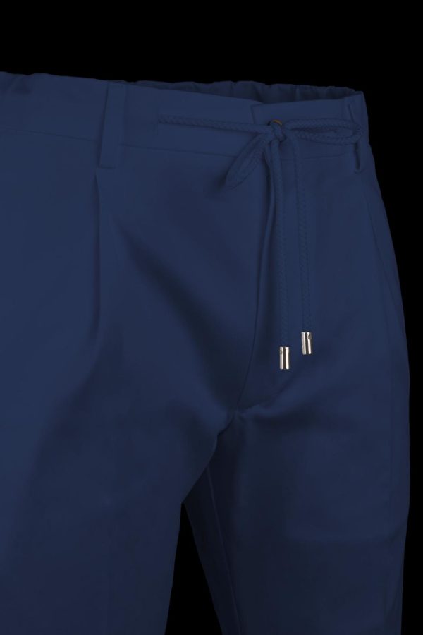Comfortable fit trousers with a cotton twill and stretch lyocell pliers. The elastic fabric belt and drawstring make it particularly comfortable. The bottom is 19 cm. The buttons are in shiny horn.