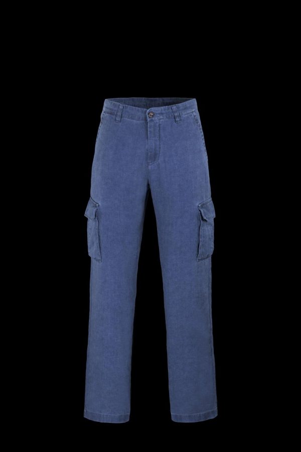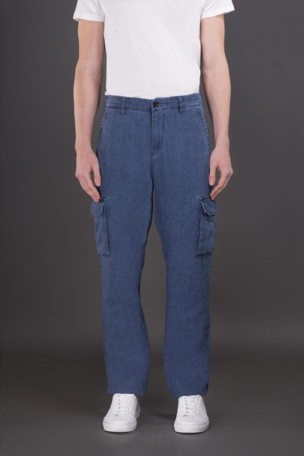 Casual cargo pants made in canvas weave, using precious indigo-dyed linen yarn suitable for wearing in any season. Through a special garment wash, a unique “used” effect and vintage appearance are achieved.