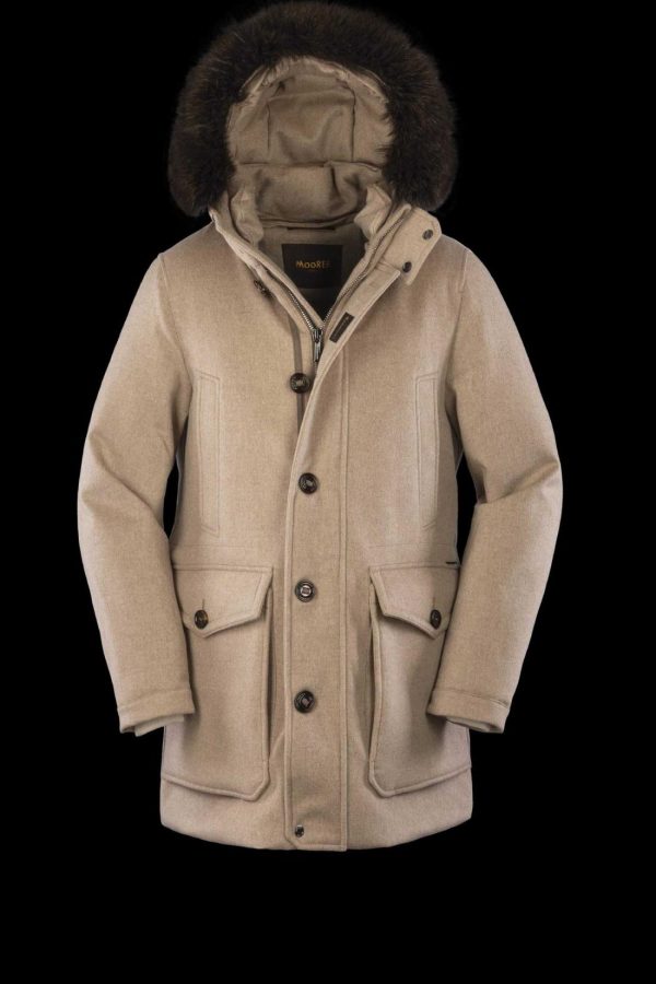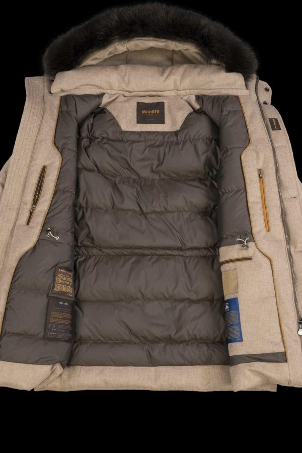 Goose-down padded parka with boudin-quilted interior. Fixed hood with removable coyote fur trim. Double front fastening with brushed metal zip and maxi horn buttons with tape loop for easy closure. Large applied pockets on the sides with rainproof flap and horn buttons. Practical chest pockets with warm lining. Adjustable drawstring at the waist. Inside pockets for valuables and logo detailing embellish and make the garment more practical.