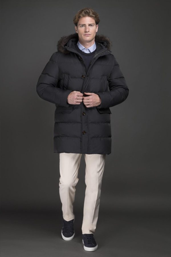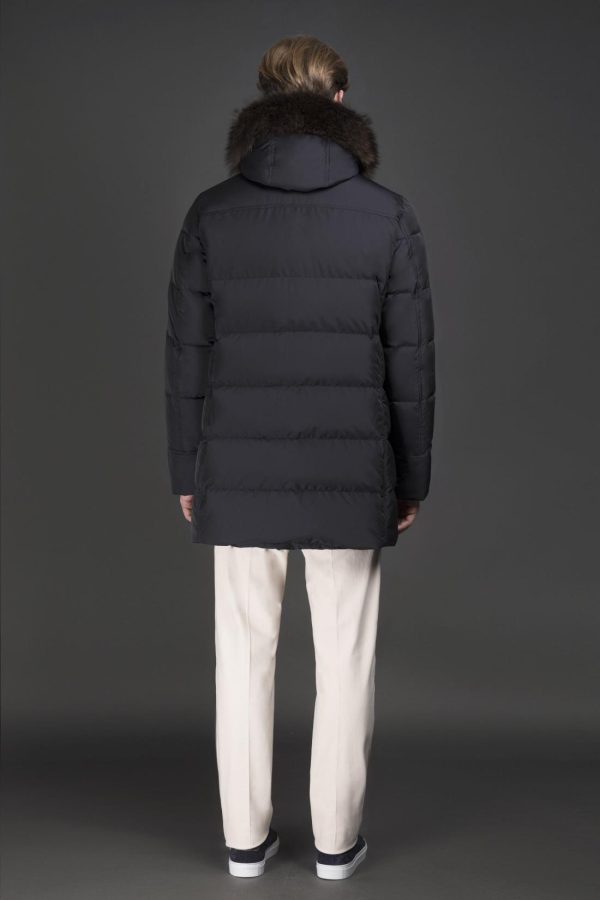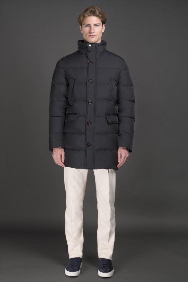 Parka belonging to the Acqua line (1 umbrella), padded with goose down and boudin quilted. Made from shape memory technical fabric with a light resin coating that gives the garment modest water resistance. The special treatment adds a subtle shine to the fabric, especially noticeable in the darker shades.