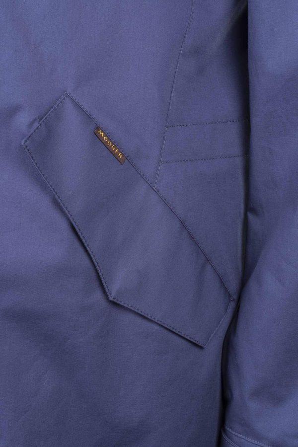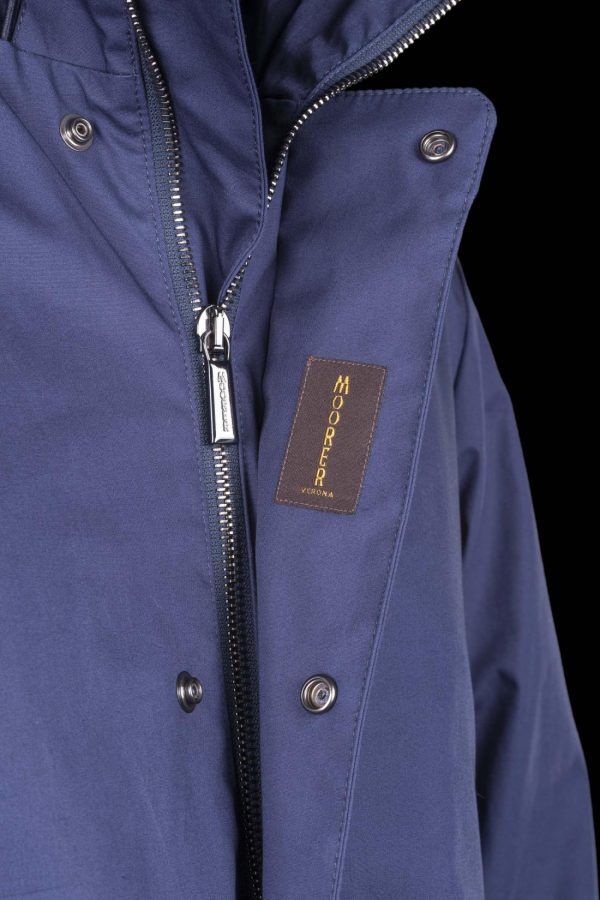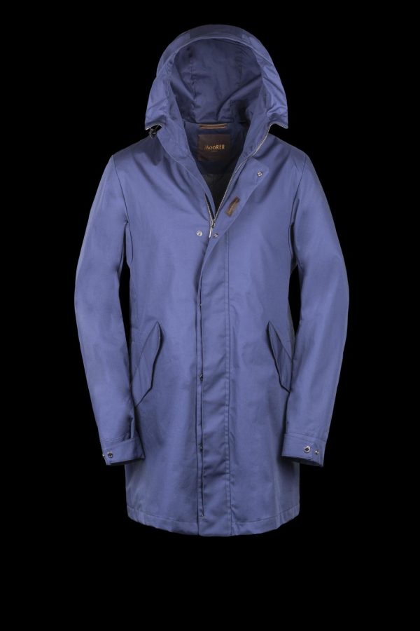 Parka (length: 85 cm.) in the Acqua line (2 umbrellas). Lined and made of matt cotton canvas bonded with a breathable membrane. Fixed upright hood with elastic drawstring. Front buttons with semi-concealed placket and snap buttons. Rainproof pockets. Adjustable elastic drawstring waist. Breathable mesh gusset on the hem and below the armpits to allow moisture to pass through. Frogs on the sleeve ends to adjust the cuffs.
