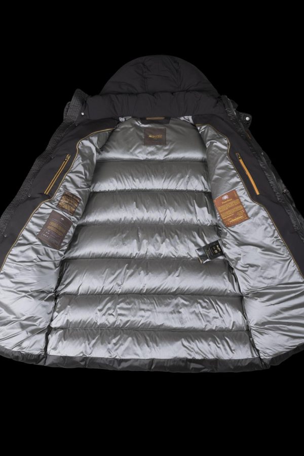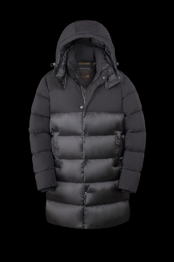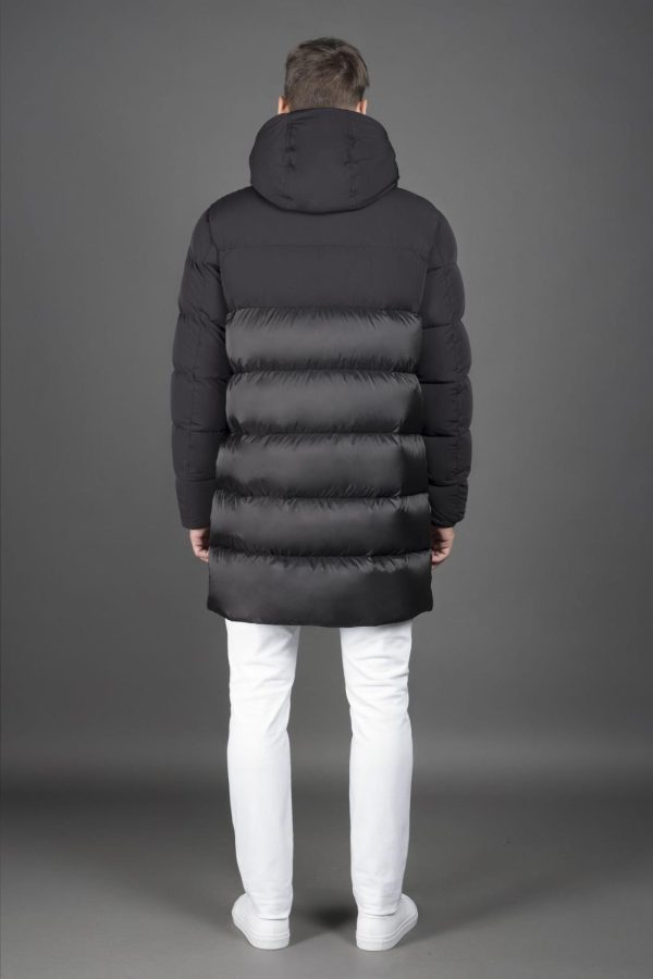 Long parka with a high level of thermal insulation, belonging to the Acqua line (1 umbrella). Made of water-repellent technical fabric combined with contrasting fabric parts on yoke, sleeves and hood.Padded with goose down and boudin quilted.