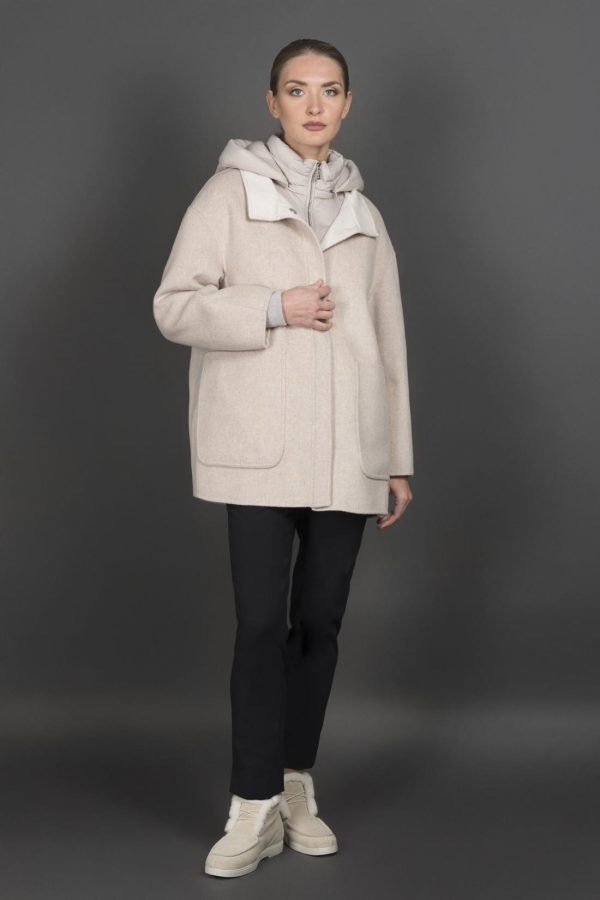 The outer cape is reversible, made of two-tone double cashmere wool with a rich appearance and soft hand feel achieved with brushed finish on both sides.