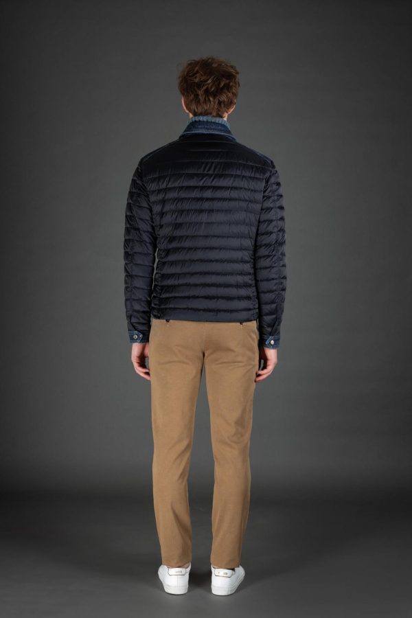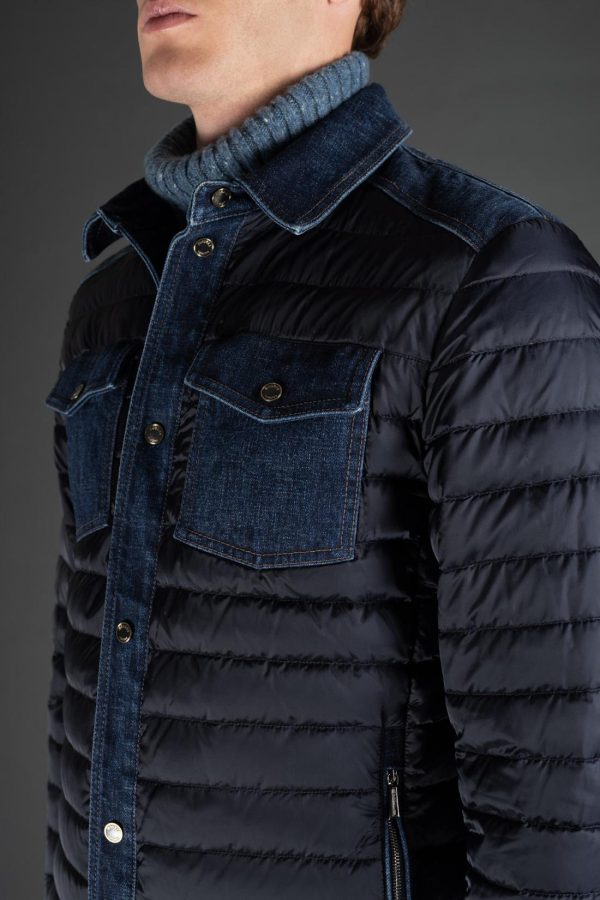Down quilted shirt in a mix of materials. Made of Japanese denim and quilted parts in goose down boudin nylon.