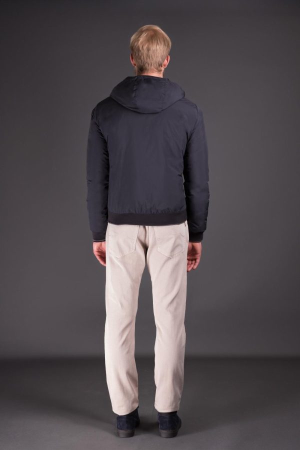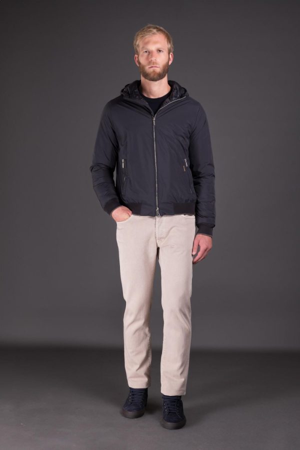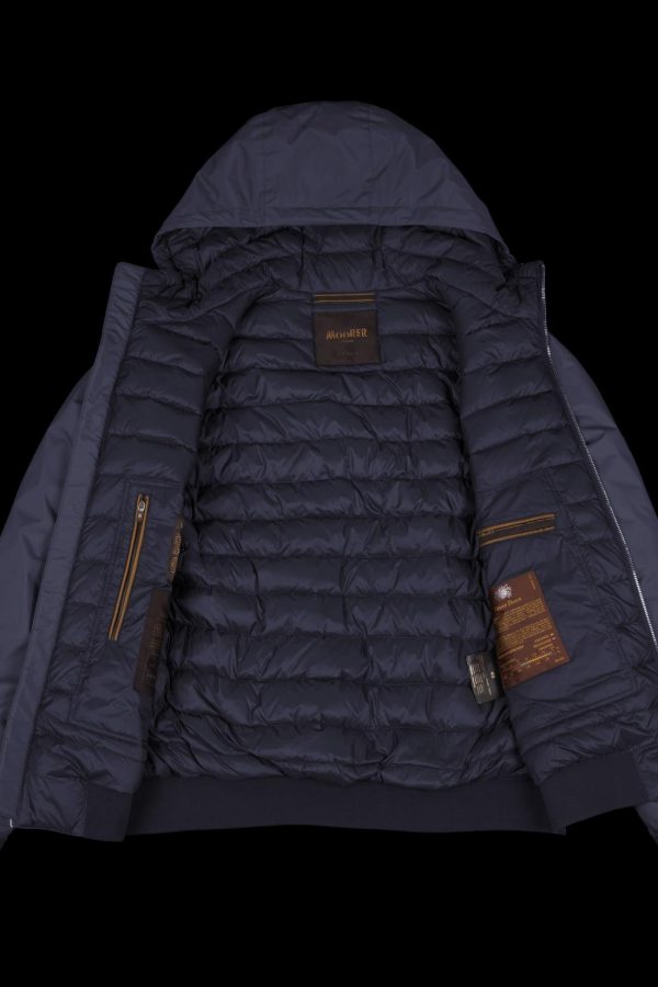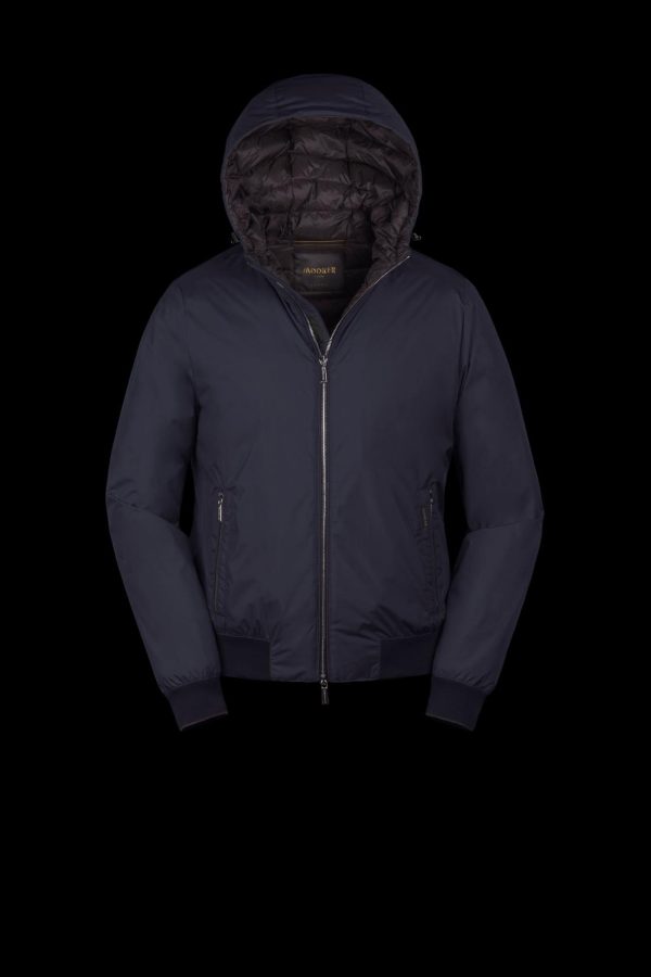 Hooded bomber belonging to the Acqua line (2 umbrellas) completely padded with goose down and quilted in a boudin style. Made from a lightweight, matte, membrane-coated technical fabric that is waterproof and windproof.