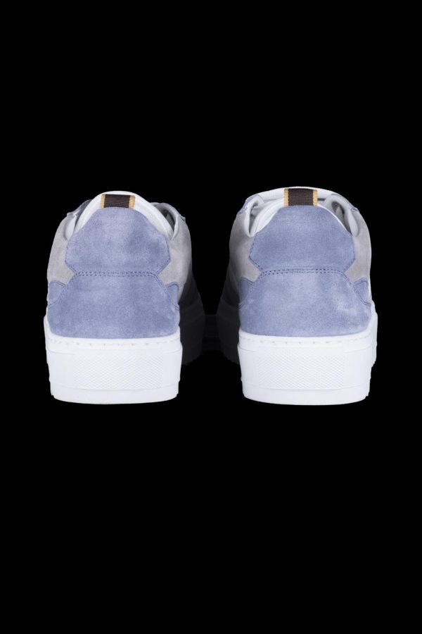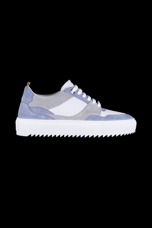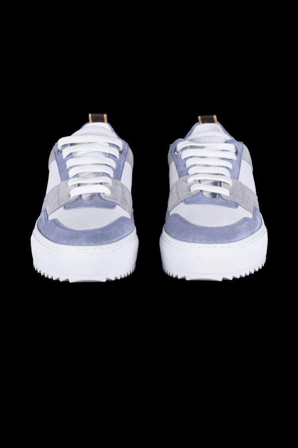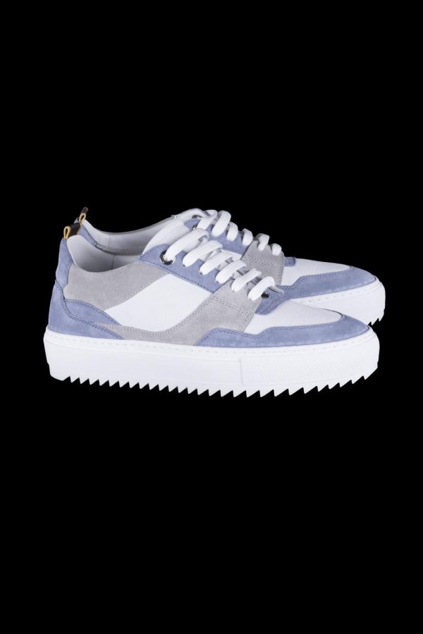 Eye-catching sneaker characterized by a mix of materials and a distinctive rubber sole.